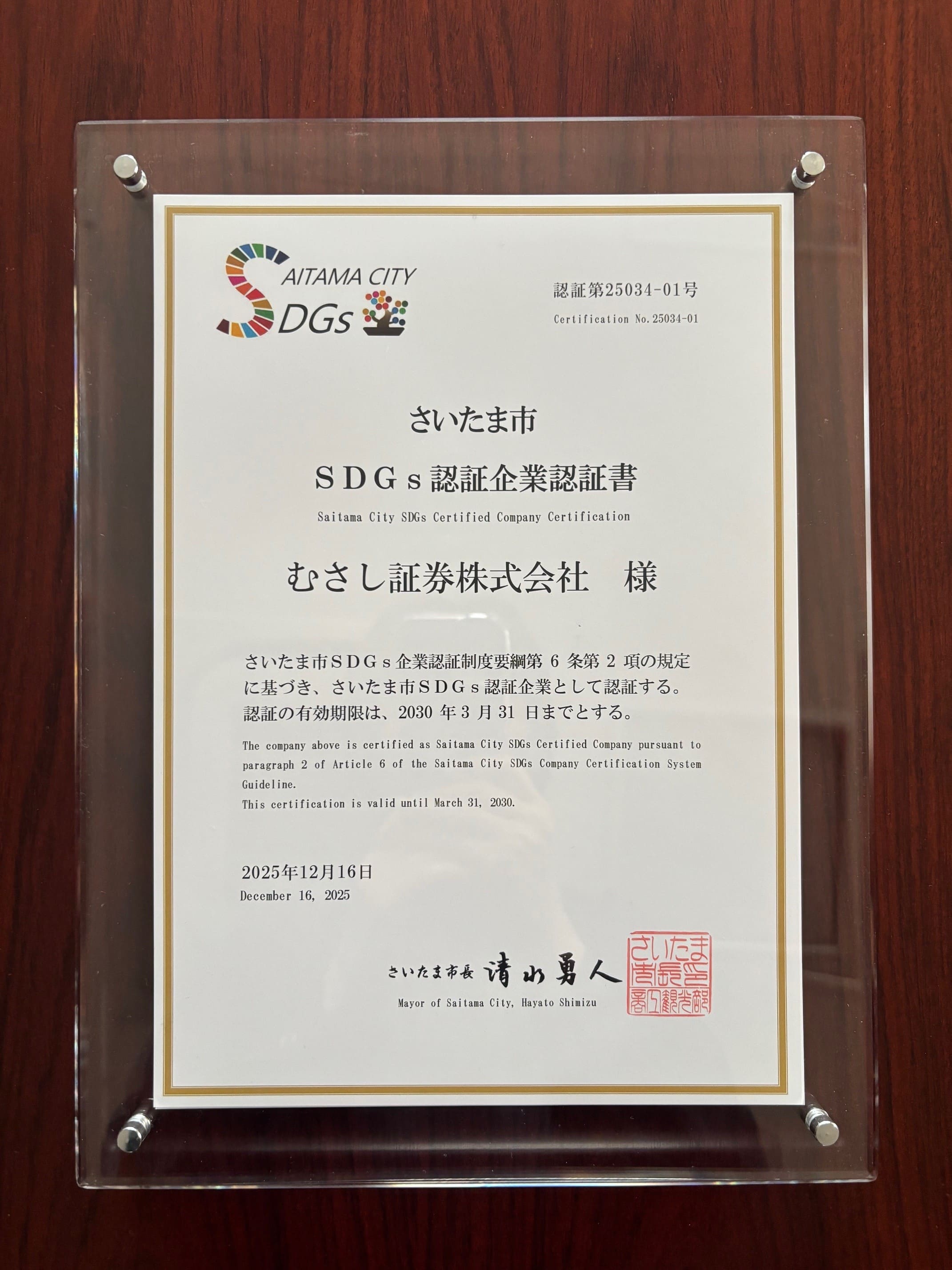 さいたま市SDGs認証企業認証書