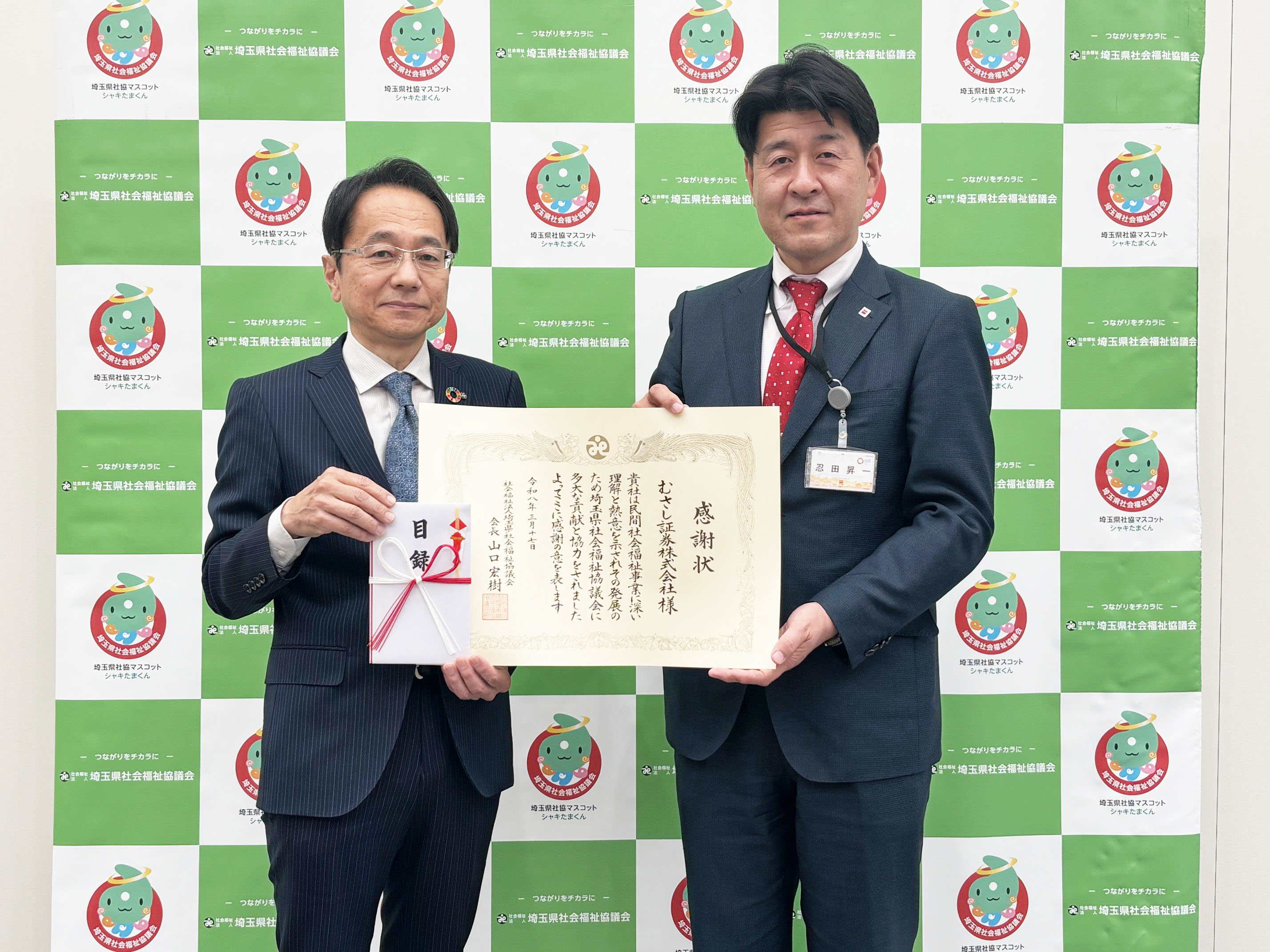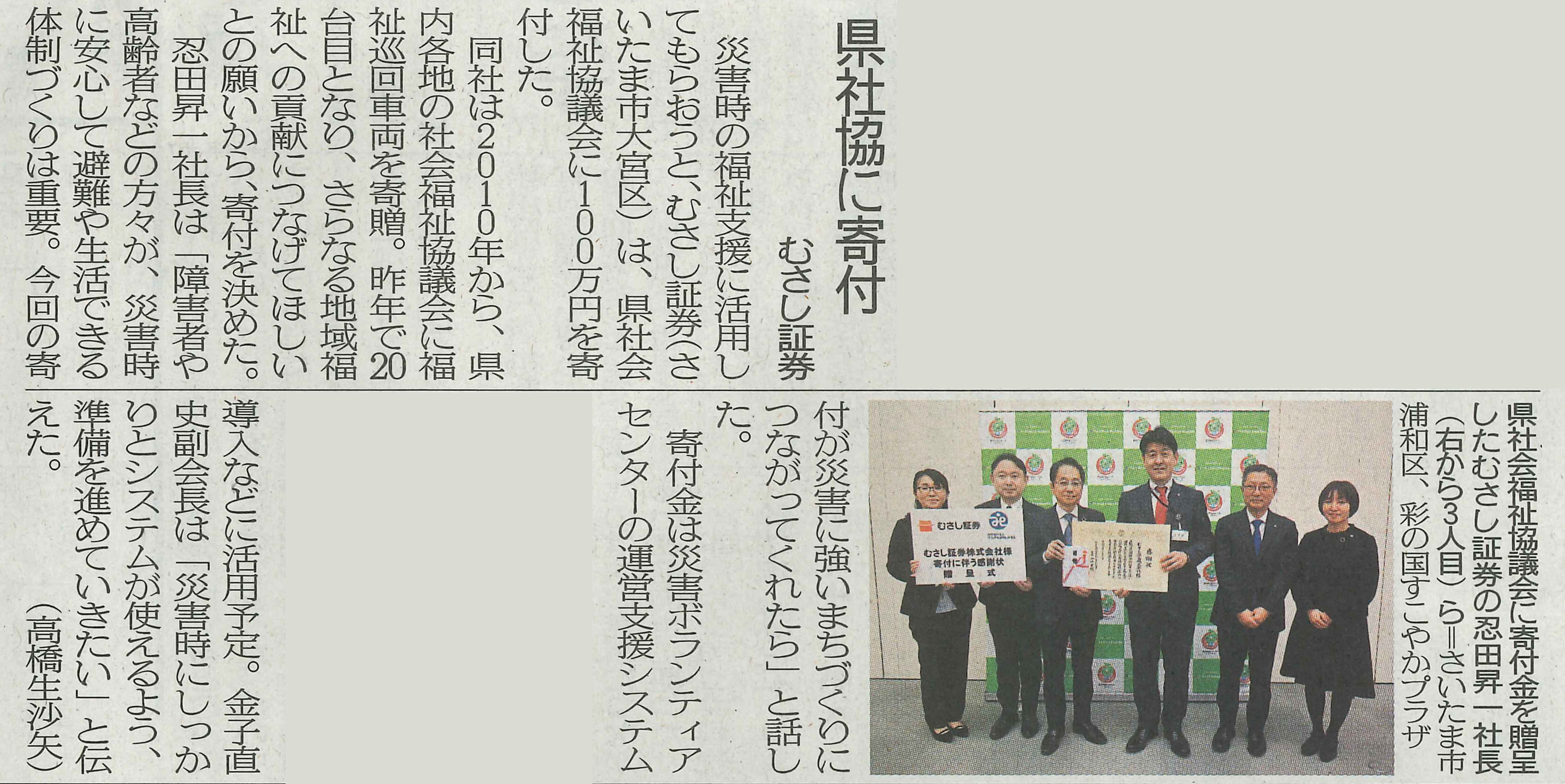 当社は2010年から2025年にかけて埼玉県および当社が営業店舗を構える県内すべての市区町村協議会へ福祉車両を寄贈してきました(詳しくは後段の「福祉巡回車両寄贈」をご参照ください)。合計台数が20台となったことを節目として「さらに地域の福祉に貢献できる支援はないか」との観点からヒアリングや情報収集を進めて検討を重ねた結果、近年の災害の激甚化・頻発化を踏まえ、災害発生時の円滑な福祉活動の支援を目的として埼玉県社会福祉協議会に寄付を行うこととしました。2026年3月に寄付を行ったところ、同協議会より感謝状を受領し、埼玉新聞にも記事として取り上げていただきました。